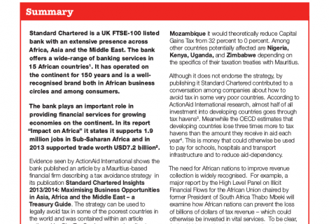 Evidence seen by ActionAid International shows the bank published an article by a Mauritius-based financial firm describing a tax avoidance strategy in its publication Standard Chartered Insights 2013/2014: Maximising Business Opportunities in Asia, Africa and the Middle East – a Treasury Guide. The strategy can be used to legally avoid tax in some of the poorest countries in the world and was contained within an article authored by Cim Tax Services managing director Gary Gowrea.